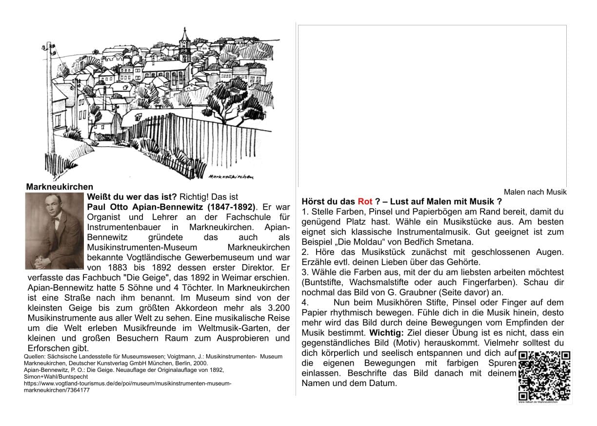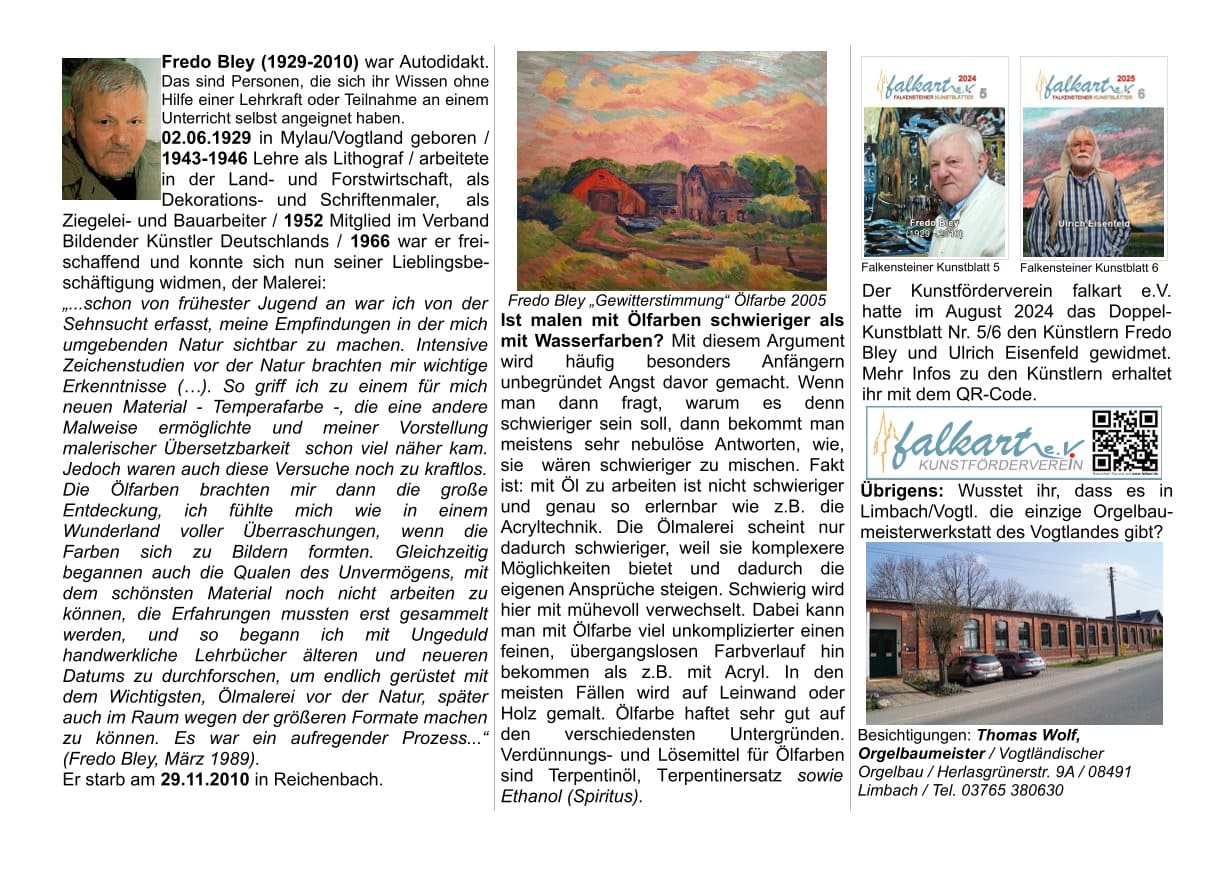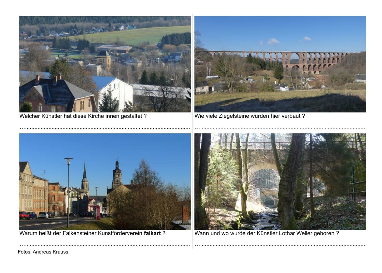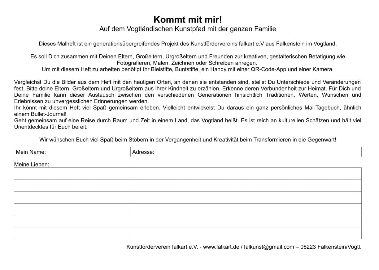 Dies ist ein generationsübergreifendes Projekt des Kunstfördervereins falkart e.V. aus Falkenstein im Vogtland, bei dem du gemeinsam mit deinen Eltern, Großeltern, Urgroßeltern oder Freunden zur kreativen, gestalterischen Betätigung, wie Wandern, Fotografieren, Malen, Zeichnen oder Schreiben angeregt werden sollst. Ihr könnt gemeinsame Zeit mit viel Spaß verbringen und vielleicht entsteht sogar ein gemeinsames Mal-Tagebuch. Das Malheft ist ab sofort hier erhältlich. Über eine kleine Spende würden wir uns sehr freuen.